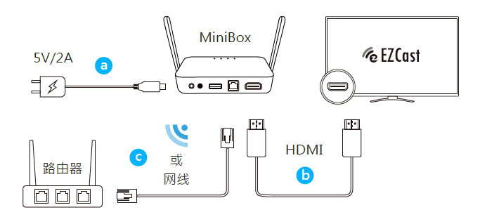 (c)Mini Box连接网络:通过Wi-Fi连接路由器,或用网线将Mini Box通过LAN口连接路由器。