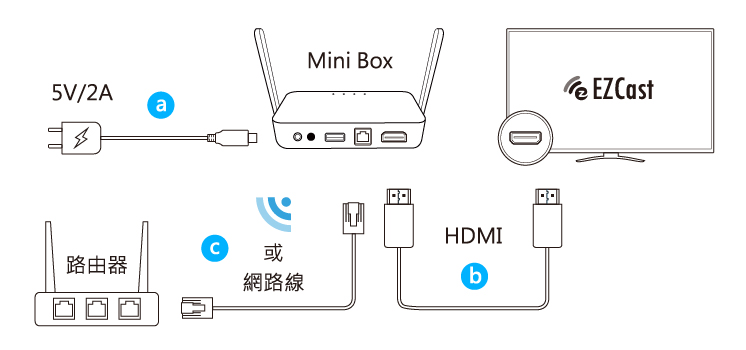(c) Mini Box 連接至網絡:通過 Wi-Fi 連接路由器,或用網路線將 Mini Box 透過 LAN 接口連接至路由器。