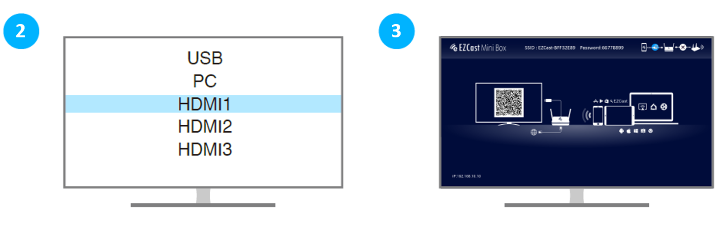 EZCast Mini Box 連接成功後,螢幕將會顯示 EZCast 主畫面(如圖所示)。請依以下步驟完成設定。